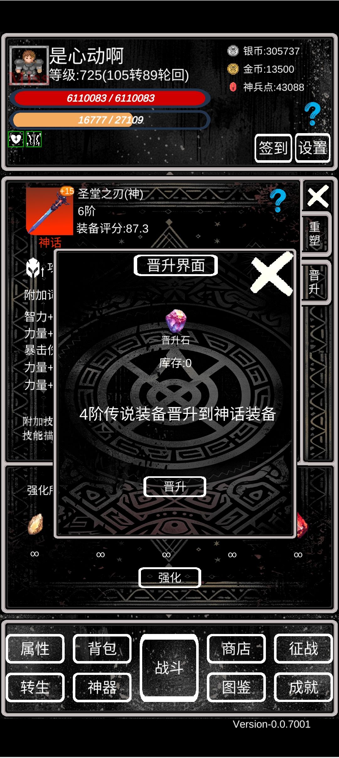 ②四阶传说装备强化+15后,用商店两万神兵点买的晋升石可以突破为六阶神话装备!转生不会消失!!!