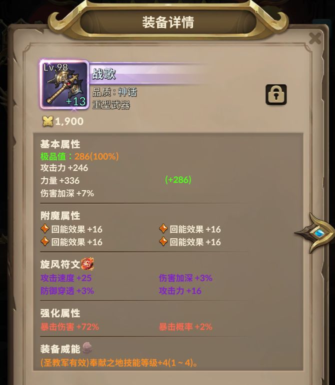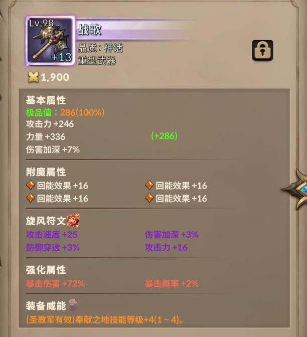 武器用纯力量的战歌,附魔4回能。威能用+3 +4技能