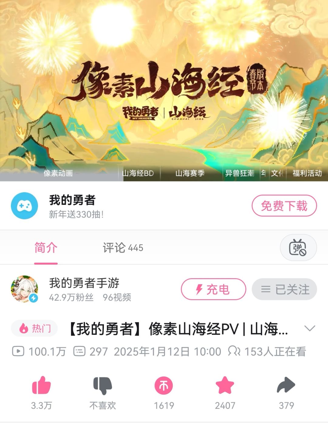 1月20日即将上线的像素山海经版本的版本PV播放量超过100万!