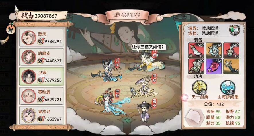 3、配速:本关配速相对宽松,要求禅速度尽可能快,唐和挂件尽可能满即可,通关阵容配速:禅修(2344)>龙人(2003)>卫寒(1901)>小唐(1811)>挂件(997);需了解:弟子释放复活功法时,当被复活者速度小于施法者,弟子复活后仍可继续行动,不会丢失回合!