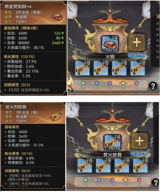 炼化方面,角色面板暴击率>70,选用二阶【乌蟾银角】,暴击率<70,选用二阶【火铜】或【蚀骨毒牙】,如图: