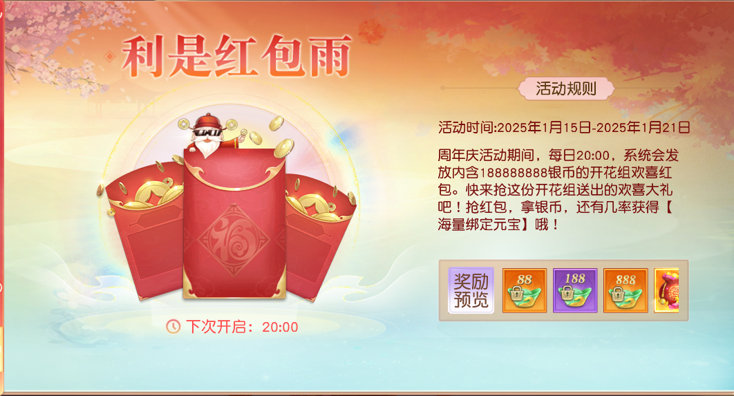 周年庆活动期间,每日20:00,系统会发放内含188888888银币的开花组欢喜红包。快来抢这份开花组送出的欢喜大礼吧!抢红包,拿银币,还有几率获得【海量绑定元宝】哦!