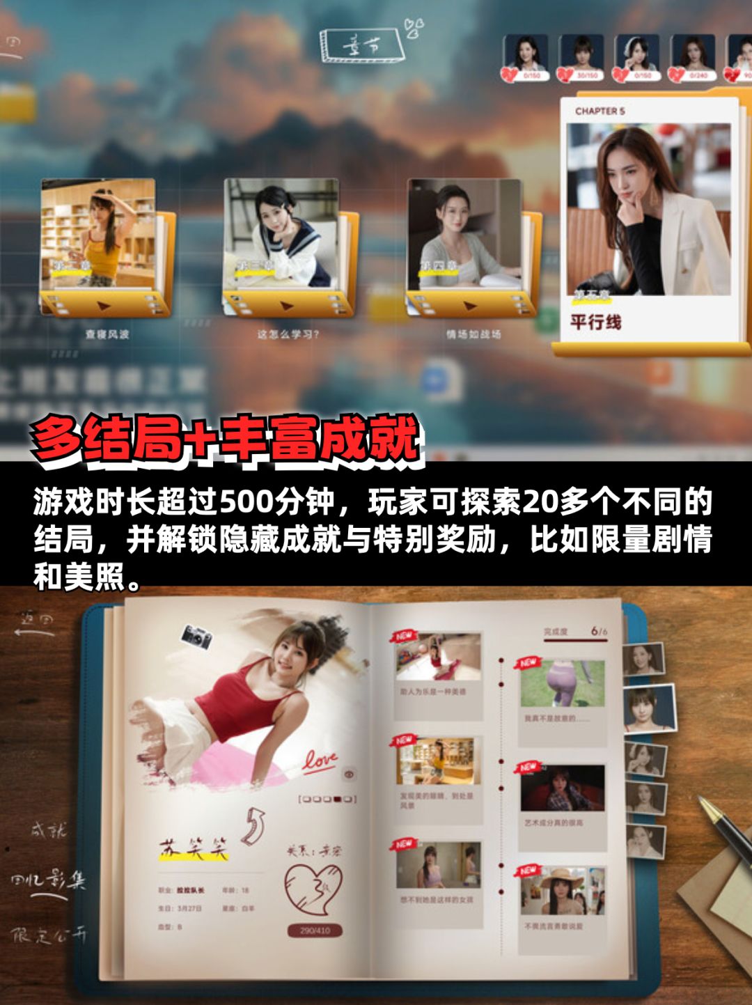 超过500分钟的游戏时长+20多个结局,探索不同选择的同时还能解锁特别奖励,比如隐藏剧情和精美美照~