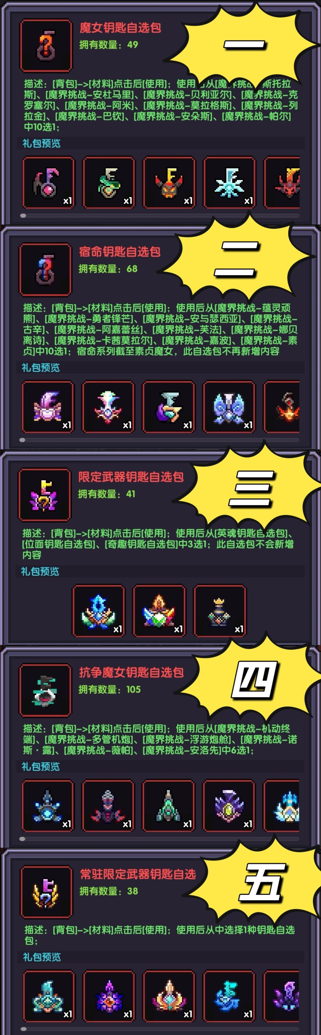 内容会新增,里面是最新的一批魔女武器,像目前最新的木系诺斯露、水系薇帕、火系安洛先都在里面,1.20更新后戎姒钥匙也会加进去。重要程度不言而喻,魔女主手武器是一切的根本,打造、洗练、魂珠升级都需要耗费很多的碎片。并且由于包的内容会更新,哪怕囤多了也不用担心浪费,下一个bd还能接着用,抗争系列结束也是比较久之后的事情了。