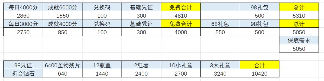 以下是获取的积分表格,零氪玩家可以免费抽到96抽,覆盖了氪金圣物的保底,但是拿不到活动保底,只能再氪1个68或者98,个人建议是98,多花30块钱,能比只买68多获得很多资源(如下图)。
