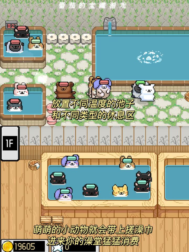 放置不同的泡池、设计不同的休息区域,让小动物来你的澡堂消费,拿到金币继续升级澡堂!