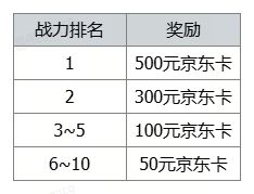 战力排名奖励1500元京东卡2300元京东卡3~5100元京东卡6~1050元京东卡