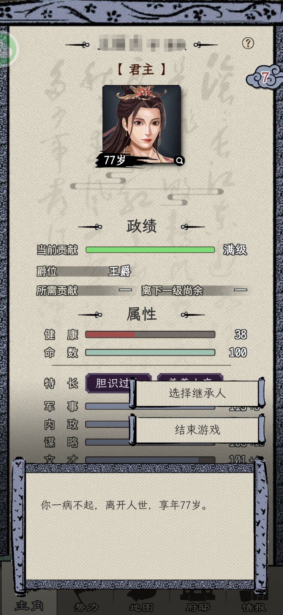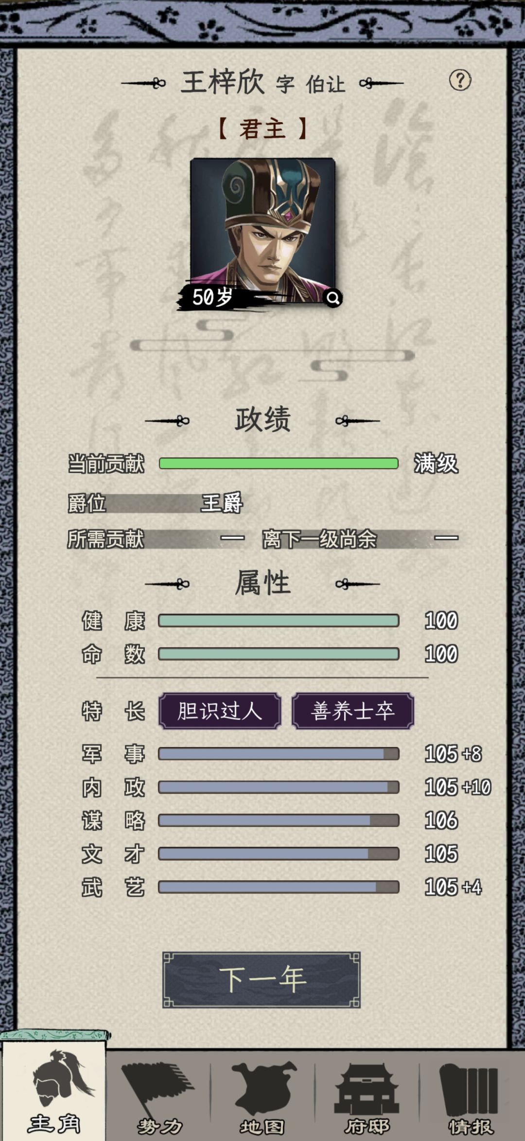 开局选九州争霸吕布势力,幻想模式NPC没有寿命,不会死,选吕布是发现他经常打曹操,容易做太守,开局十个药先安排上,五品前每年必立功,剩余时间劫营>比武>巡城以收集资源,到达五品时,要注意每年城市的攻伐战,吕布大概5年打一次曹操,当我看到吕布要打汝南时,去汝南给贫民发钱把声望拉到尊崇,打下汝南后吕布必然让你做太守(战争内不要自动,手动去敲城墙,敲下城墙就算赢),然后是漫长的升一品,这是看广告最多是时间段,每年都要看广告立功,每年问吕布要一个人,把他吸干,到一品的时候自立,先把吕布打了(这时候他四个城,但是武将只有七八个了),然后把曹操打了,打曹操最后一个城,失败了没关系,每年都要打,拿到曹老板这一票武将后,做内政打城池都非常容易了,主角到了四十多岁后每年会掉线,每年找华佗可以延缓死亡速度,第一次死可以看广告复活,第二次死真的就游戏结束了,但幸好我结婚早!死的时候提醒我可以选继承人(王梓欣是我第一个主角的儿子)!那时候我就知道可以永久玩下去了,所以和某个武将亲密到90时候找他做媒结婚是很有必要的,死后除了属性和政绩值不能继承,其他的都可以继承。开了学宫以后连到满属性满技能很快的,后期全是名将,几乎不用看广告,除了钱,其他资源是用不完的,钱主要是为了资助每个城的贫民,这样可以在市场刷出好书,满足我对属性收集的癖好。