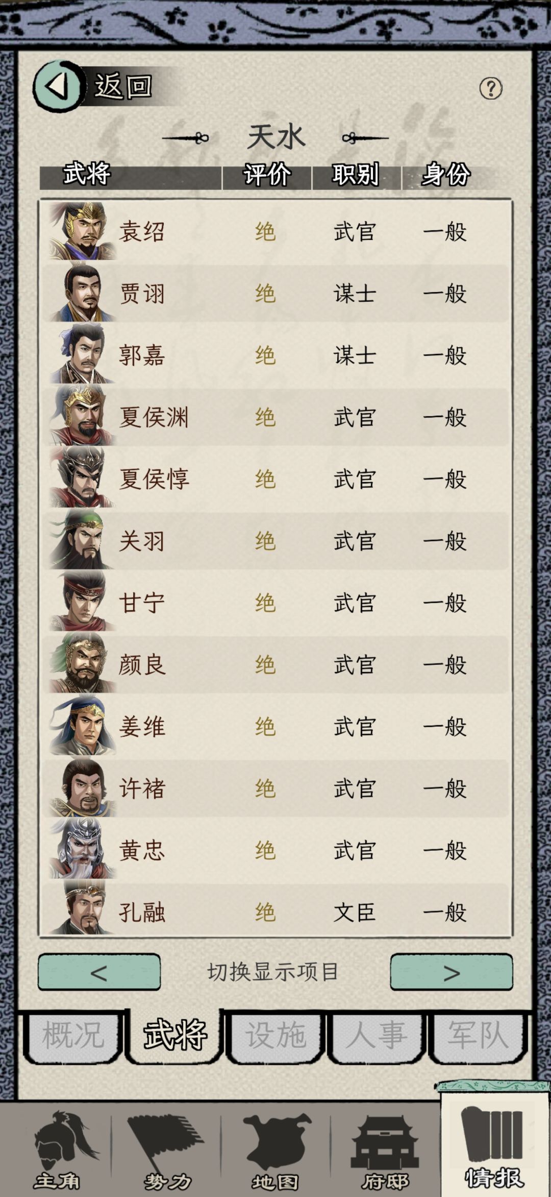 总之这个游戏的关键就是当太守,我之前幻想模式跟刘备,这个乡巴佬占了一个白城以后就不打仗了,我升到一品比诸葛亮还高就是当不了太守,所以看到自己的领导一直不打仗的话索性退掉重开。