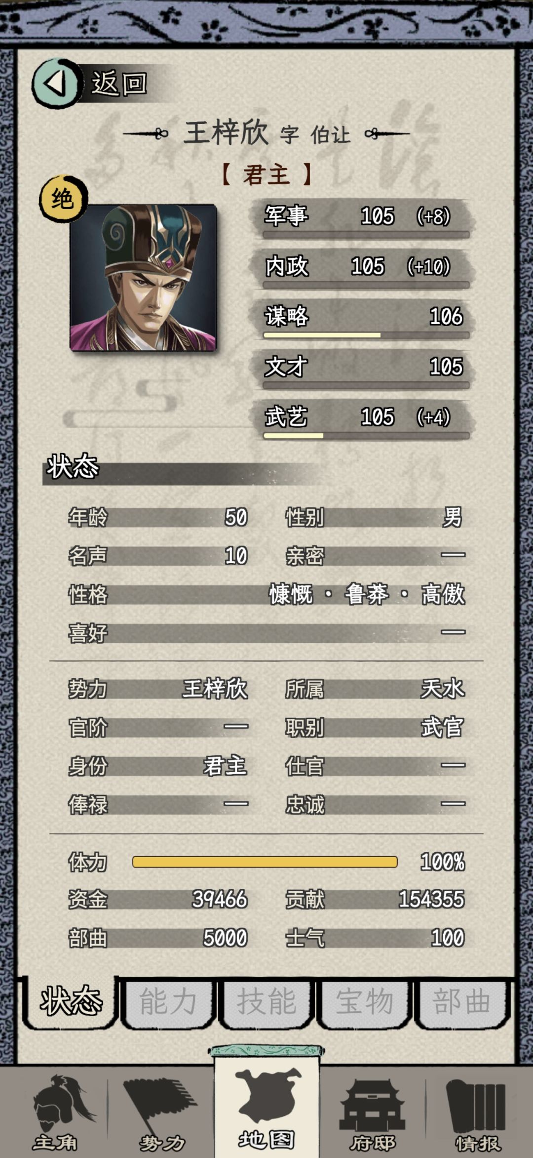 君主,130个回合左右,城池几乎全占(留了一个城没占),能力全满,技能全满,绝品武将几乎全收集,部曲满虎豹骑