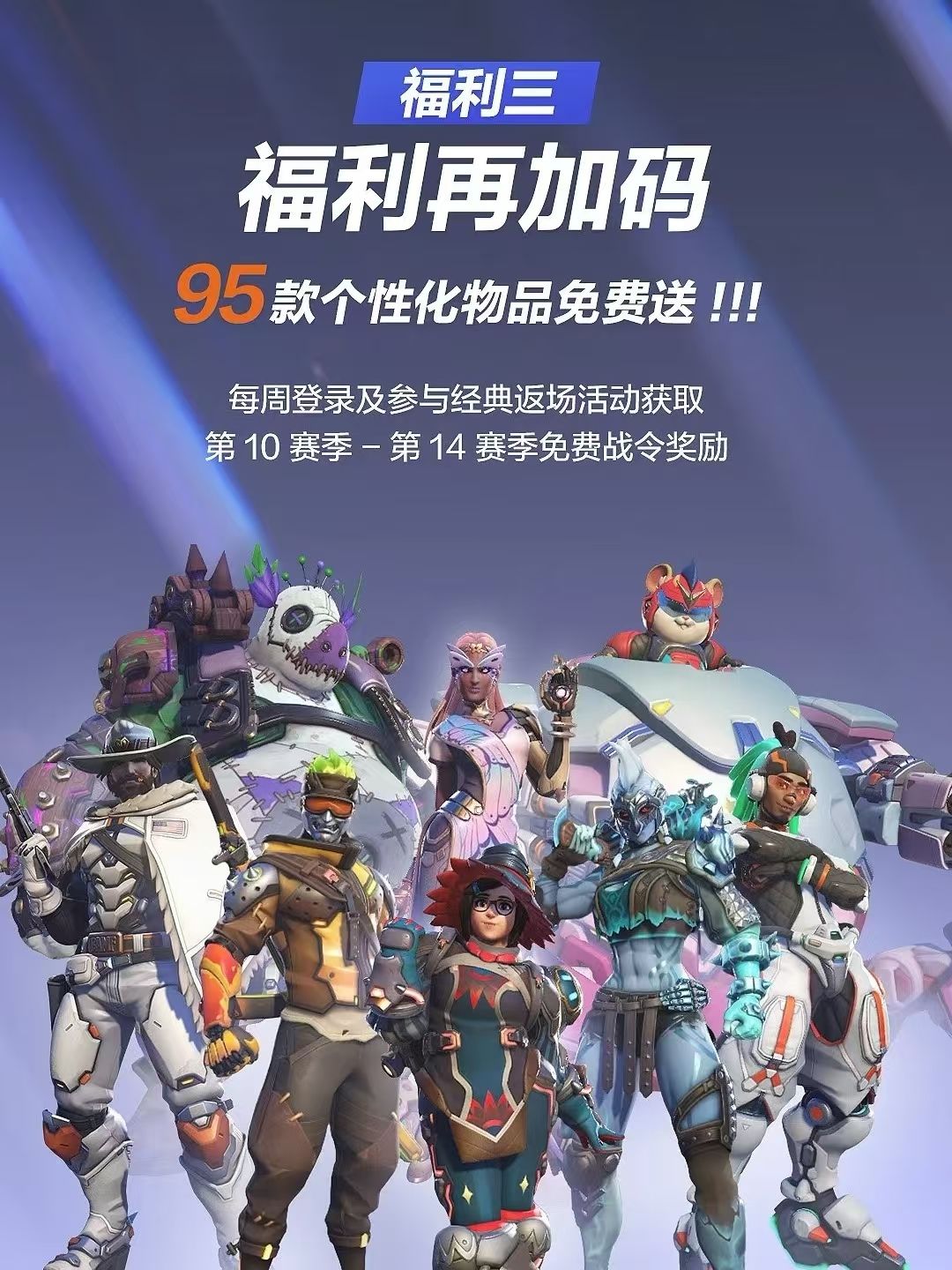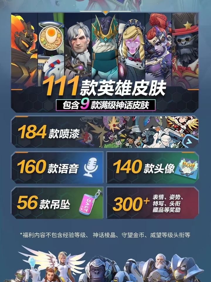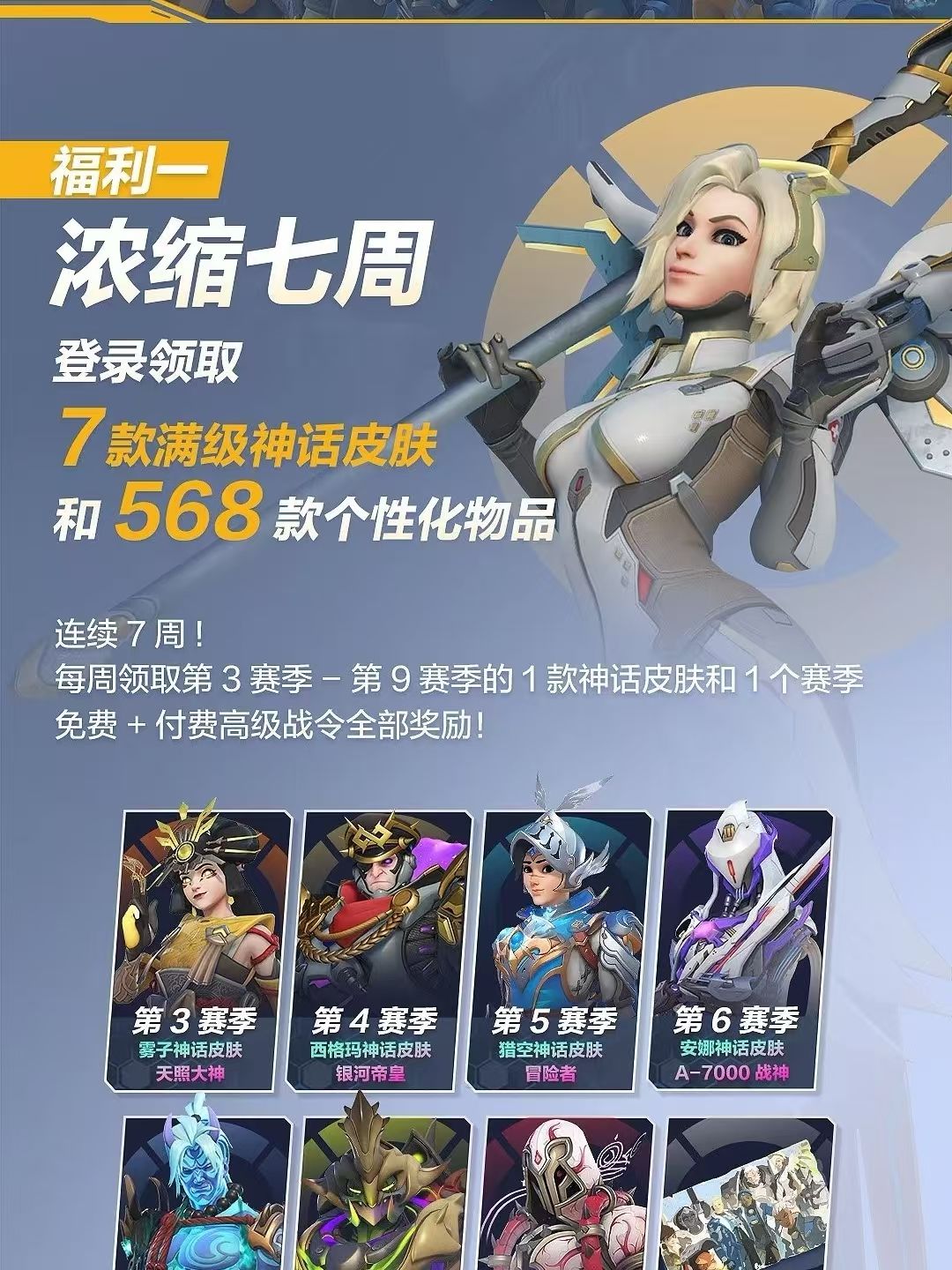 (从图三开始看)【一】2月19日《守望先锋》国服开服后,每周登录游戏均可领取第3赛季-第9赛季中的一个对应赛季神话皮肤和一个赛季的免费+付费高级战令全部奖励。奖励可连续领取7周,共计7款满级神话皮肤和568款个性化物品。活动持续9周,截至第15赛季结束,在前7周就会将奖励更新完毕。并且,玩家在活动期间的任意时间登录游戏都能领取之前更新的所有登录奖励,不用担心错过!