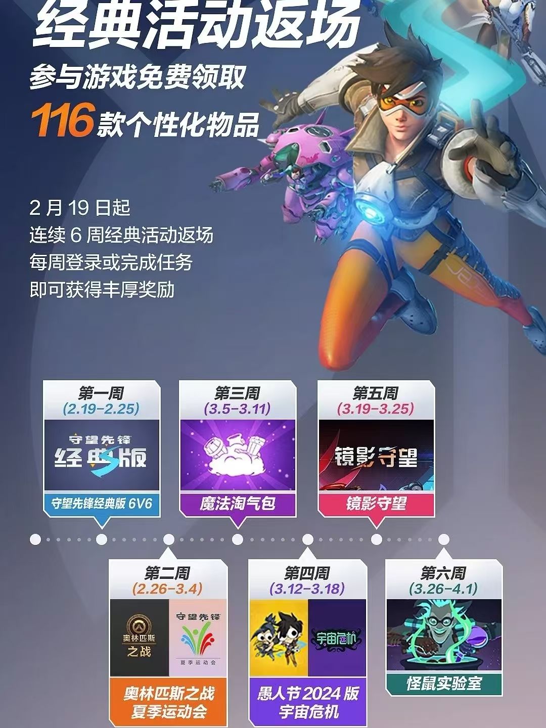 【四】经典活动返场,2月19日开服后,每周都有不同的经典活动开放。参与陆续开放的守望先锋经典版6V6、魔法淘气包、镜影守望等活动,共计可获得116款个性化物品。需要注意的是,经典活动在指定时间内开放,错过活动将无法获取奖励。