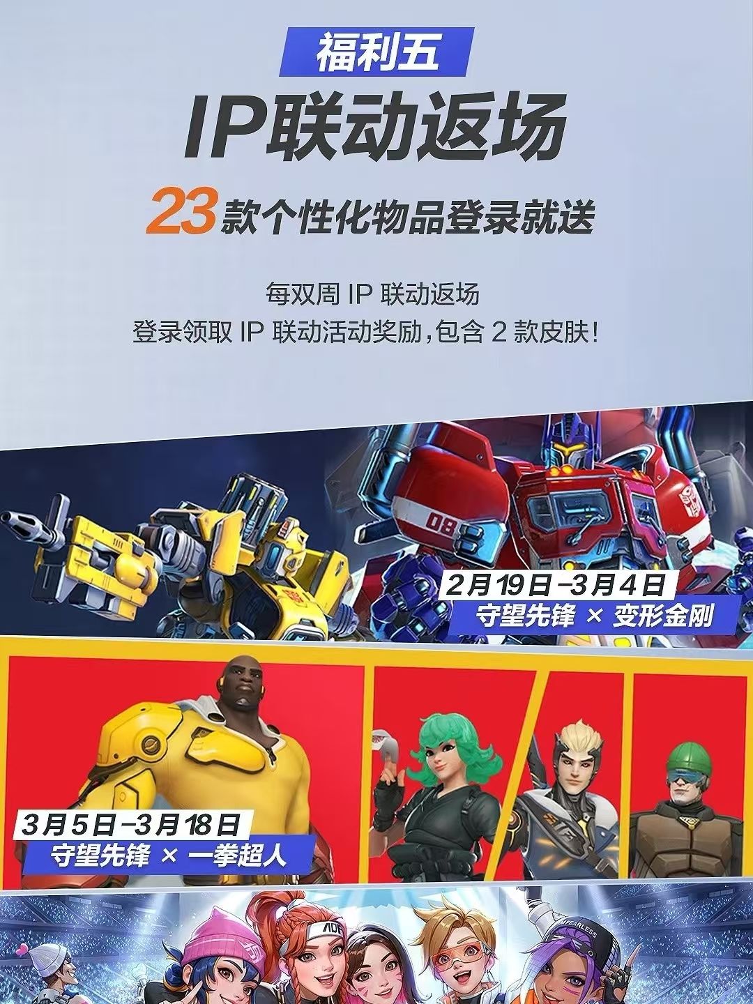 【五】联动返场,2月19日-3月4日(第1、2周),《变形金刚》联动中的6款个性化物品将返场;3月5日-3月18日(第3、4周),《一拳超人》联动中包含士兵:76皮肤“无证骑士”在内的6款个性化物品将返场;3月19日-4月1日(第5、6周),“LE SSERAFIM”联动中包含狂鼠皮肤“法尔克西·詹姆斯”在内的11款个性化物品将返场。IP联动返场活动同样在指定时间内开放,错过活动将无法获取奖励。