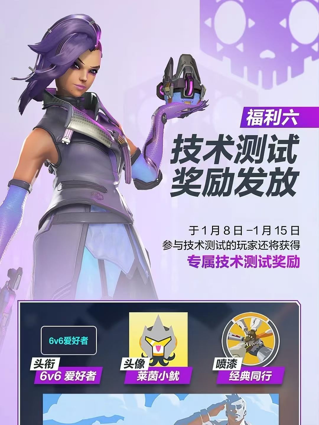 【六】测试福利。2月19日开服后,参与了不限号技术测试的玩家还将获得专属技术测试奖励——【头衔】6v6爱好者、【名牌】战地指挥官的守望、【头像】莱茵小鱿、【喷漆】经典同心。#今天游戏圈发生了啥 #咨询评论员 #守望先锋 #游戏讨论 #游戏资讯