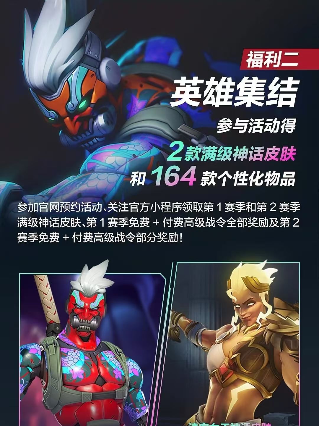 【二】现在参与官网回归预约活动、关注官方微信小程序活动,以及网易大神、企业微信等相关活动,还可免费再得第1赛季、第2赛季的对应赛季神话皮肤和免费+付费高级战令全部奖励。2款满级神话皮肤——源氏神话皮肤“赛博恶灵”(4级)和渣客女王神话皮肤“宙斯”(4级)及共计164款个性化物品都可在2月19日游戏开服后登录领取,千万不要错过!