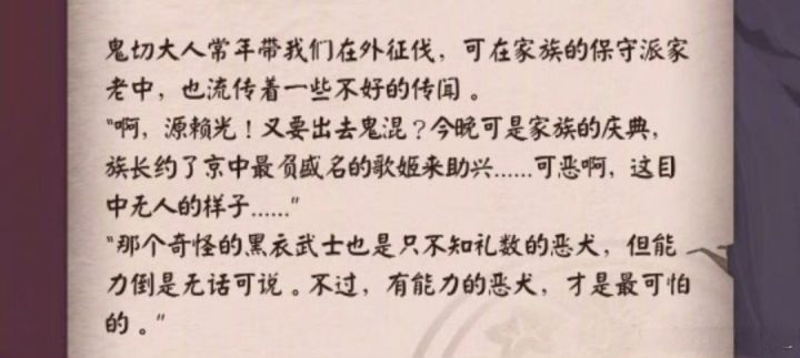 源赖光原本没有观看歌舞的爱好,此次却出现在这样的场景中,明显与人物原有设定不符。晴明也不大可能只因曾帮助过孔明,就让其前来跳舞助兴。而四大舞姬的身份,按常理不应出现在这样的场合。不知火作为传说中绝美神秘的大妖,在此跳舞令人费解。铃彦姬身为神女,自降身份为人类跳舞也不合情理。孔雀明王放下一国之事只为跳舞同样让人难以理解。更让人无法接受的是,当着神女、大妖和国王的面,说出“让这个世界进入人类的时代”这样的话语。