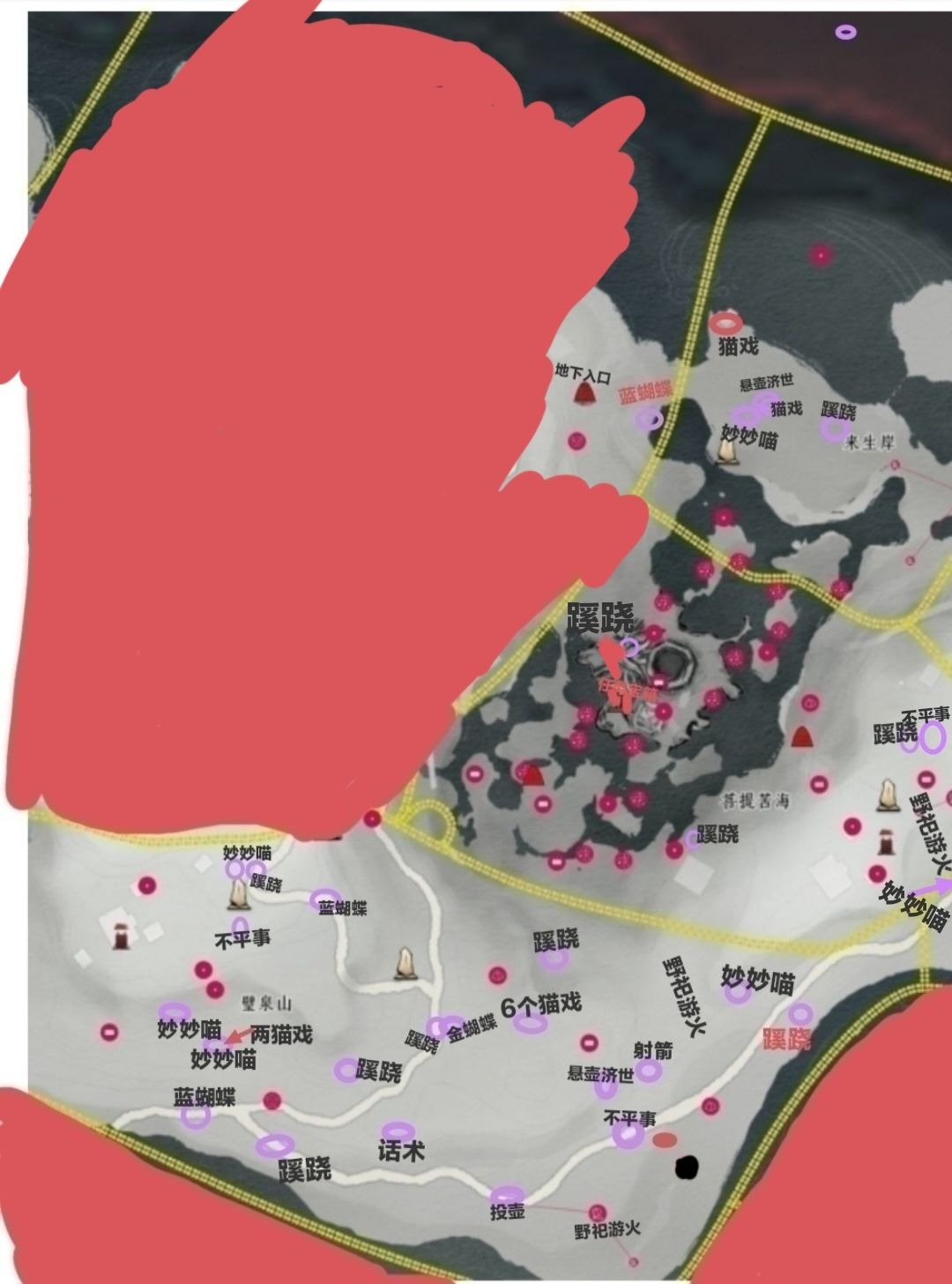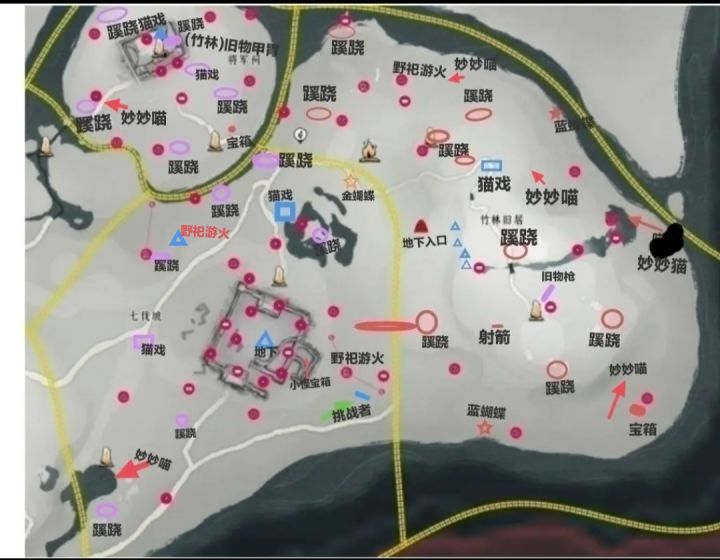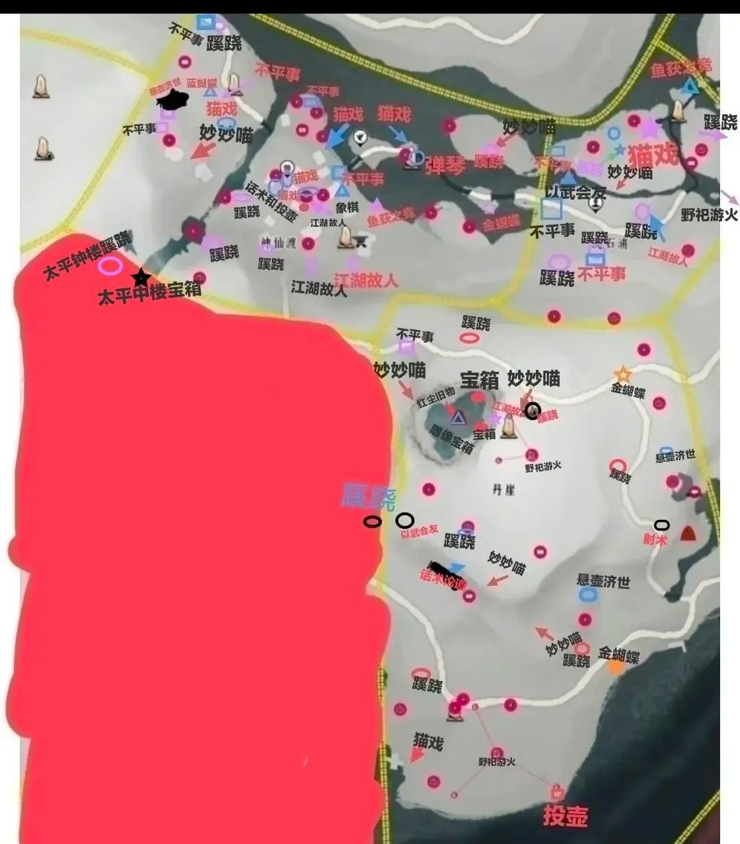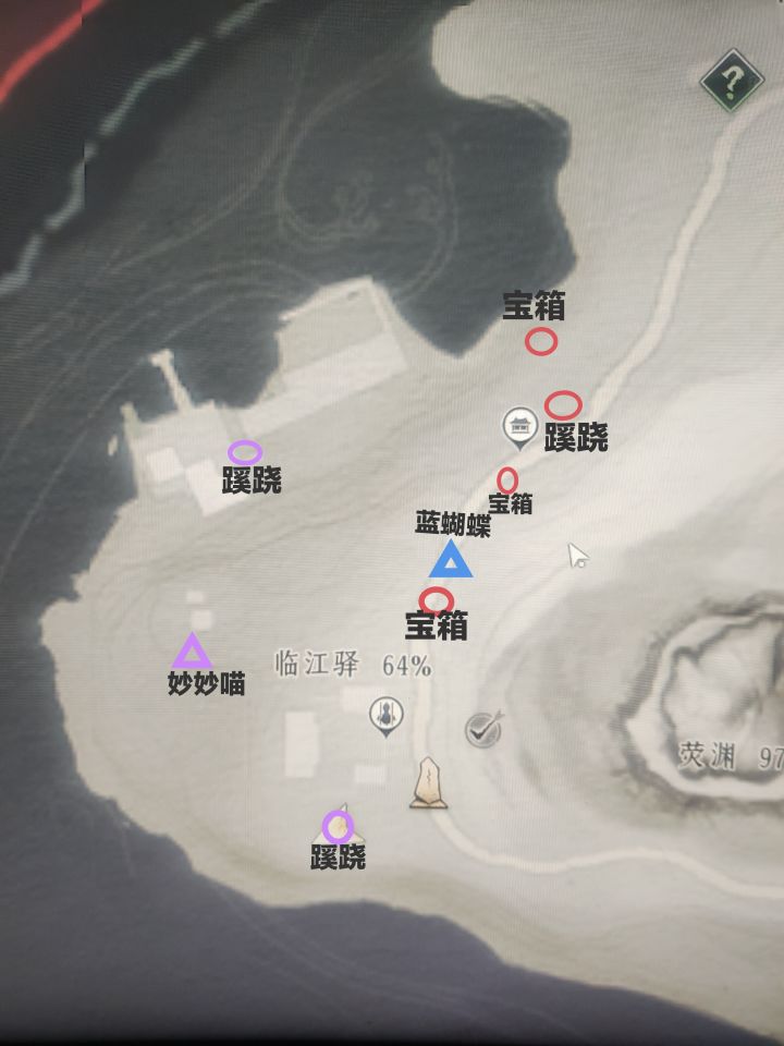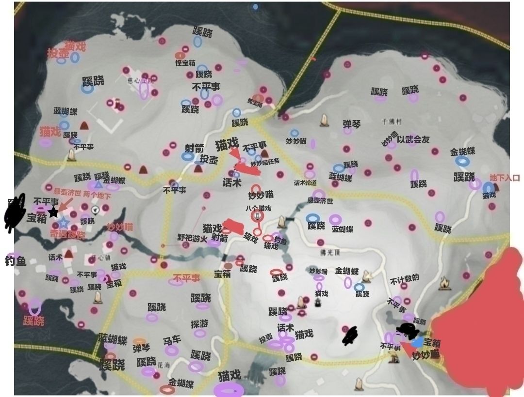 同时这是根据武林录做的,有多余会傍边标注什么字,少宝箱的任务宝箱或隐藏宝箱,天地万籁是金蝴蝶,曲径通幽是蓝蝴蝶,
