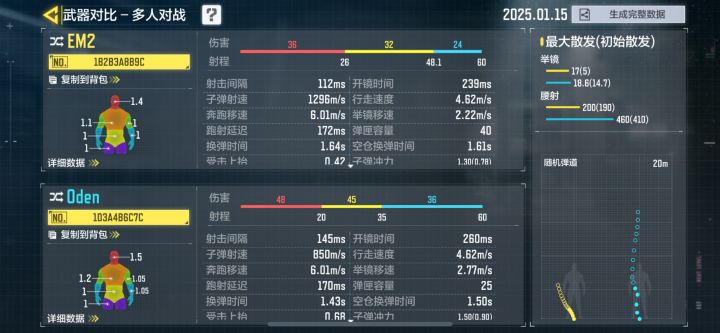 与现版本最强慢射速枪欧登相比,em2有更快的射速,弹夹比多了15发,后座机也低,比欧登的上手难度低很多