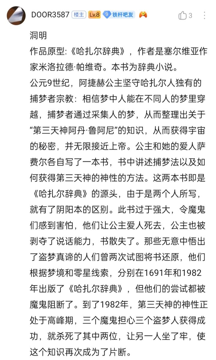 最喜欢的作品原型是《哈扎尔辞典》,感觉跟洞明的超实体“明灭”有关系
