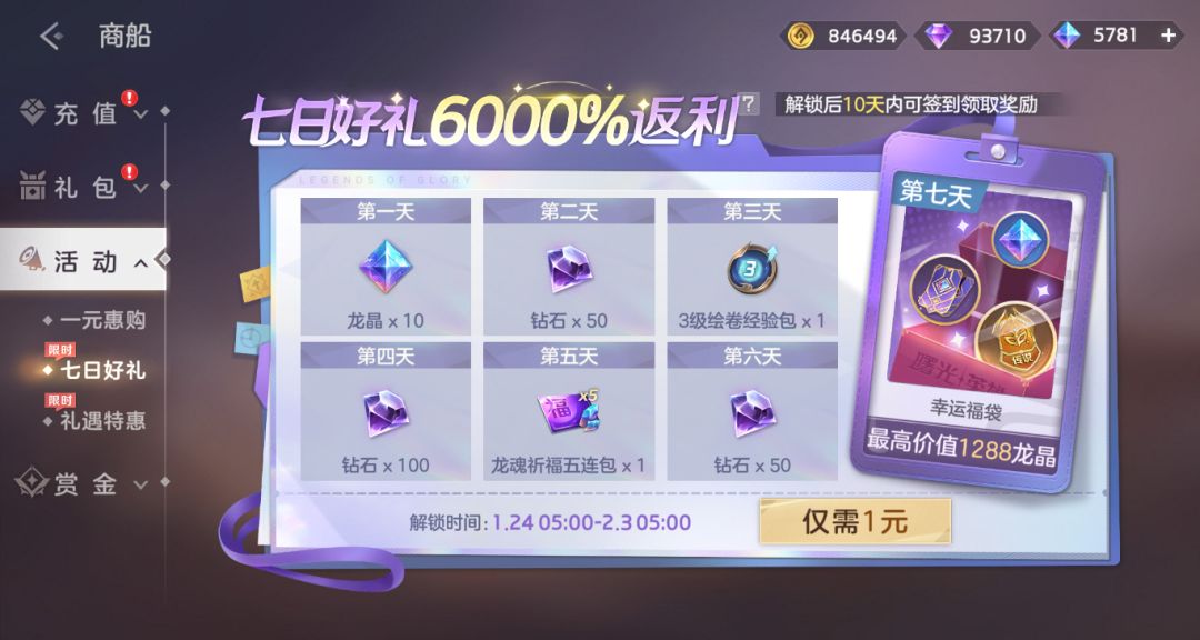 付费一元解锁登录活动,登录游戏即可获得龙晶*10、龙魂祈福卡、绘卷经验包等奖励。累计登录七天后随机获得传说皮肤自选箱、龙晶*188、礼券*500、皮肤碎片*10中的一个奖励