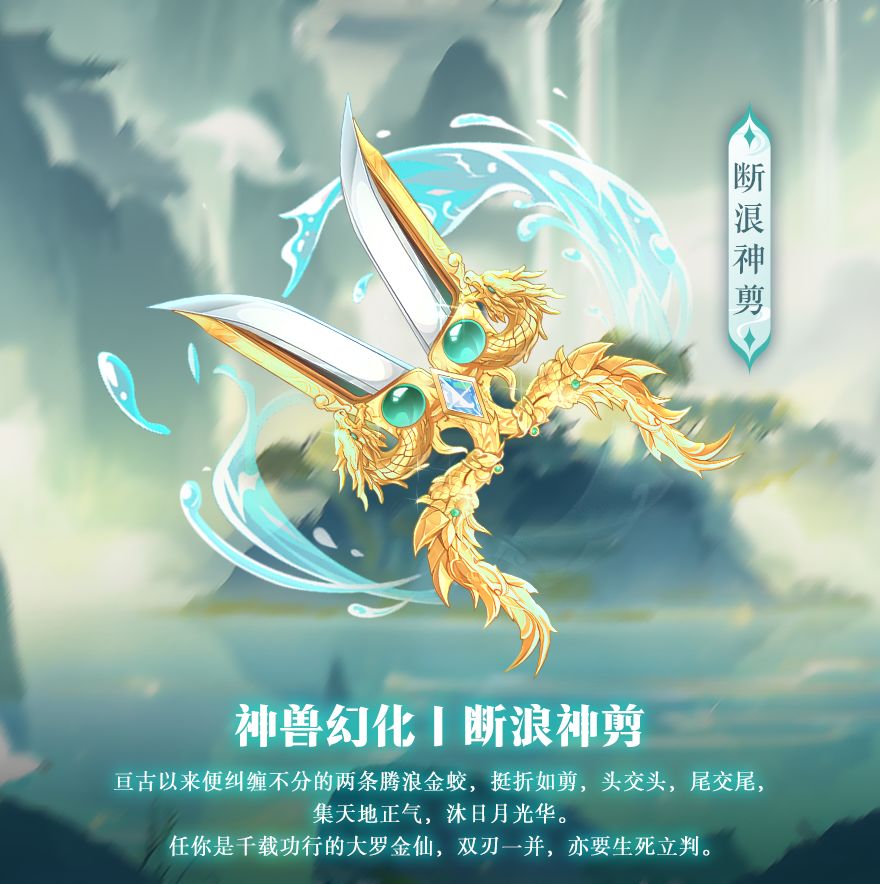 1、神兽幻化系统新增“断浪神剪”幻化形象,消耗「断浪神剪碎片」,即可解锁或升级“断浪神剪”幻化形象