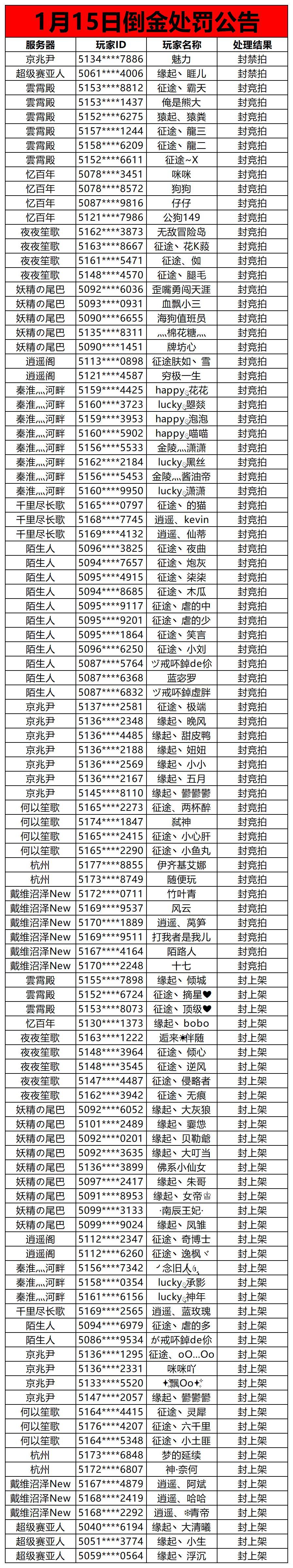 亲爱的冒险家: 我们一直致力于维护游戏公平性、保证良好的绿色游戏体验!让所有冒险家都能在我们的世界里享受到冒险带给大家带来的快乐。但是目前游戏内出现一些不法分子,利用游戏给冒险家创造的自由交易机制进行非法金币交易,倒卖等违规情况。严重影响游戏玩家的游戏体验与游戏公平。在此,我们游戏官方发表正式通告,对于此类不法现象,将会给予严厉的抵制与惩罚! 对于倒、卖金币的【双方】实行在线、实时、顶格的处理和惩罚。 将根据账号违规程度实行最高:封禁购买,封禁上架,封号等永久或非永久性处罚措施。对于举报人我们也将给予鼓励与实质性的奖励! 以下为部分处罚信息,请各位冒险家爱惜自己的游戏账号,自觉维护游戏内的良好生态环境,共同守护我们的冒险家园!
