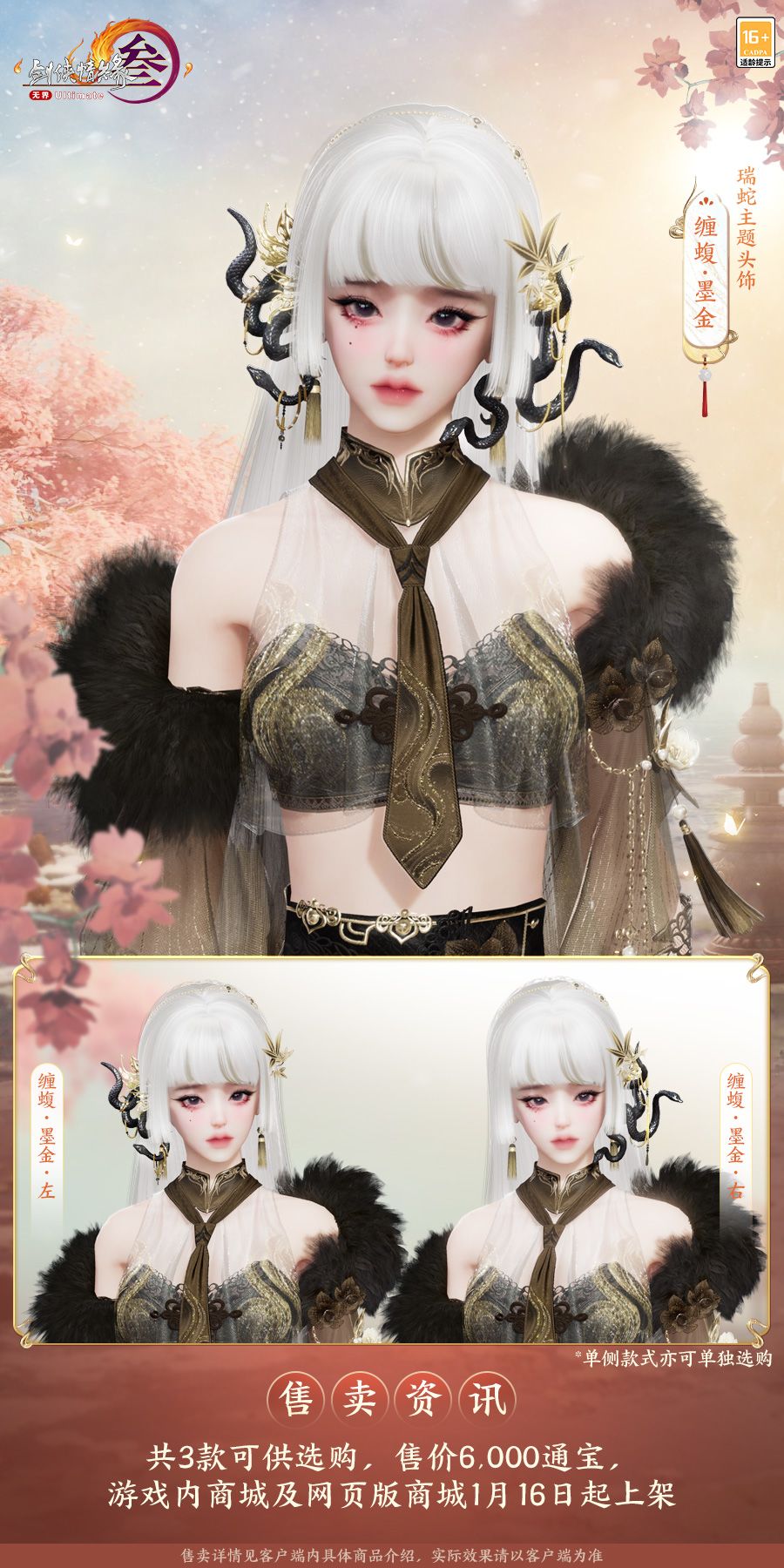 瑞蛇主题头饰“缠蝮”盘桓鬓边,弧度别具一格,从容优雅。黑白两色头饰还各有单侧款式可单独选购,根据自身喜好随心选择,搭配头饰位置自定义功能,侠士多种巧思皆可实现!