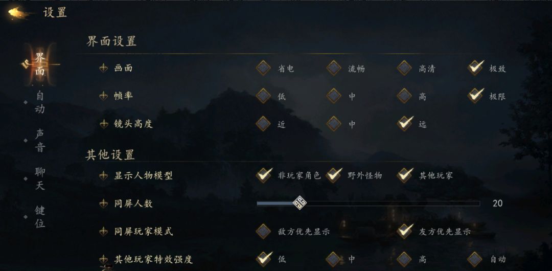 其他设置,如果玩家们想以更低的机型获得更加流畅的体验的话,可以选择降低同屏人数,降低其他玩家特效强度,这样便可以得到一个相对而言体验不错的游戏设置了,能在实际游玩过程中获得更加良好的体验。
