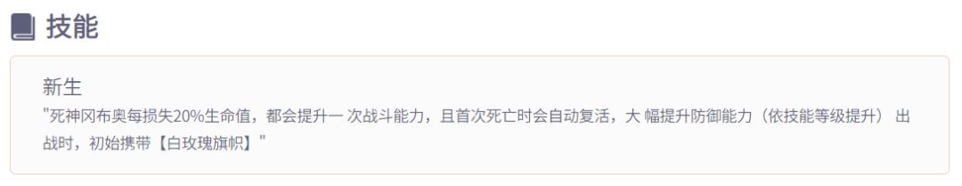 死神冈布奥每损失20%生命值,都会提升一次战斗能力,且首次死亡时,会自动复活,大幅提升防御能力(依技能等级提升)