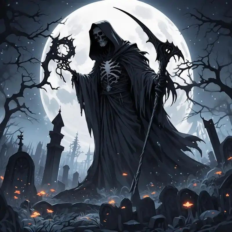 死神常穿一身黑斗篷,手中拿着一把巨大的镰刀