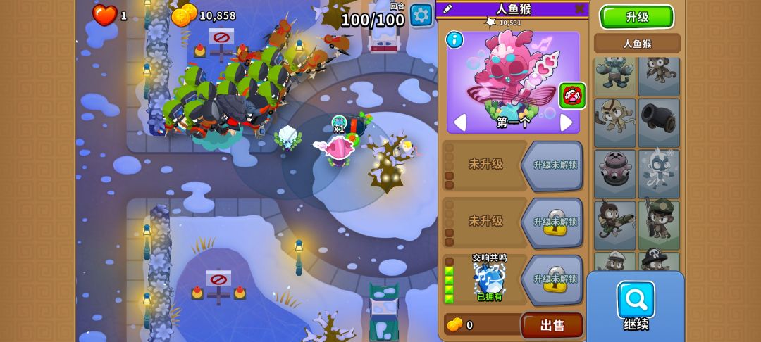 今日高挑:开局502忍者+204忍者,然后逐步补出来14个030忍者(尽量让主力猴吃到大部分buff),然后在95回合前把一个030忍者升级到250,95回合用250忍者技能过,98回合之前补004人鱼和420胶水(放在图中位置),98回合用两次技能过,100回合用技能过