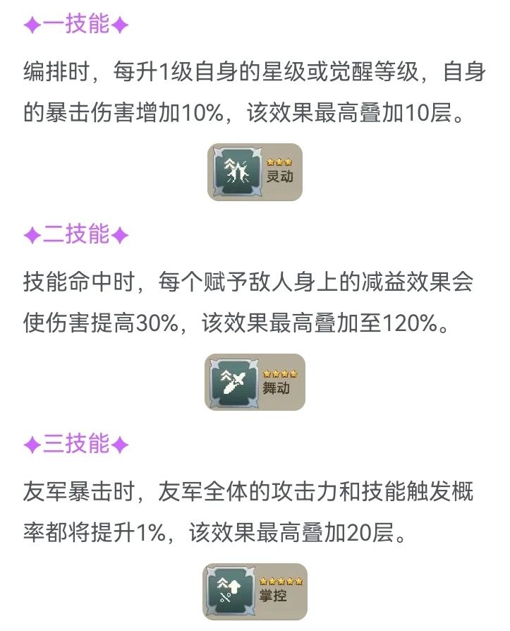 4星即可拥有爆伤编排加成,5星技能提供爆伤和穿透,觉醒技能能给对方上debuff(虽然实战中被清的很快)