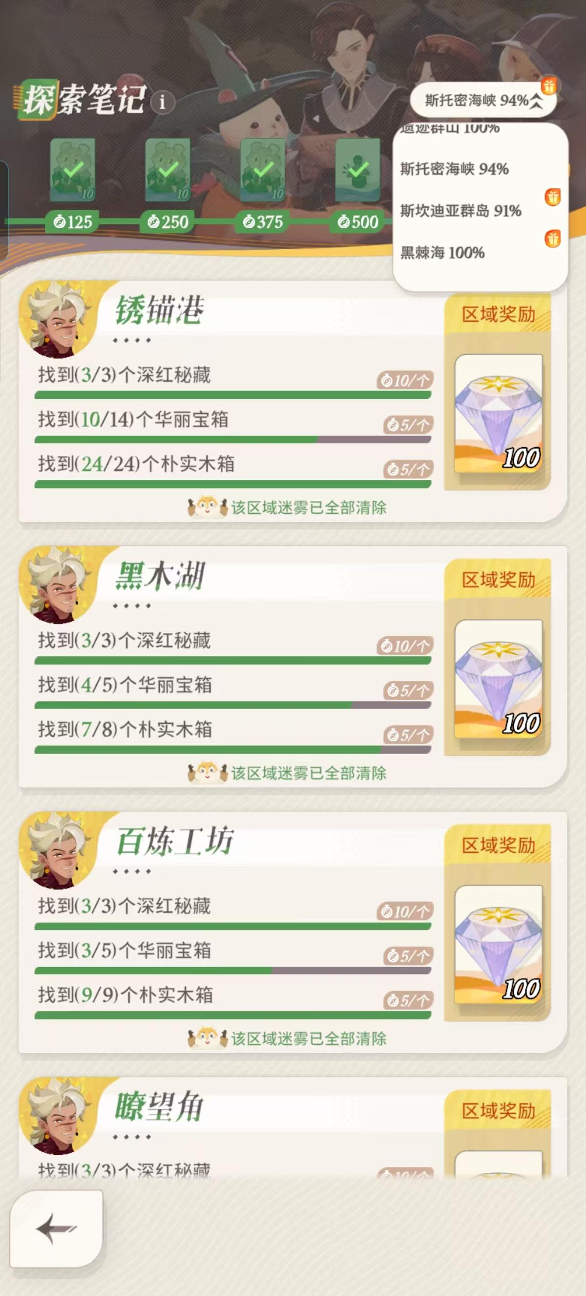 最后就是大世界探索度,尽量在本赛季内将探索度拉到100%,虽然后续可以在时光之颠体验锈锚钢赛季内容,但是探索度同时与锈锚钢赛季内容关联,进入时光之颠就无法完成赛季任务了。