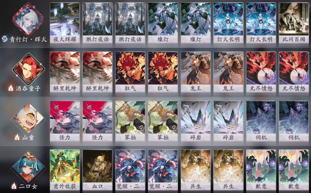 能打的只有两套,战技红莲跟辉灯酒吞。通过式神配合,旨在中期最大化收益。
