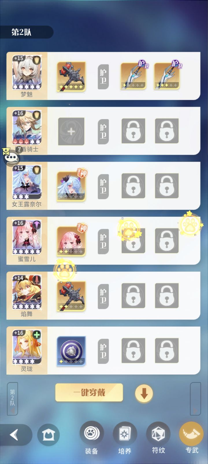 速通最低配置,只需要0星天极角色和两把5星sr圣器,焰舞、梦寐这俩必养角色,两个三星挂件露奈儿和玲珑