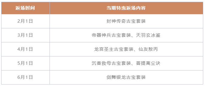 2月1日起,福灵宝库将陆续返场以下内容,“当期特惠”结束后,道具会进入“往期返场”