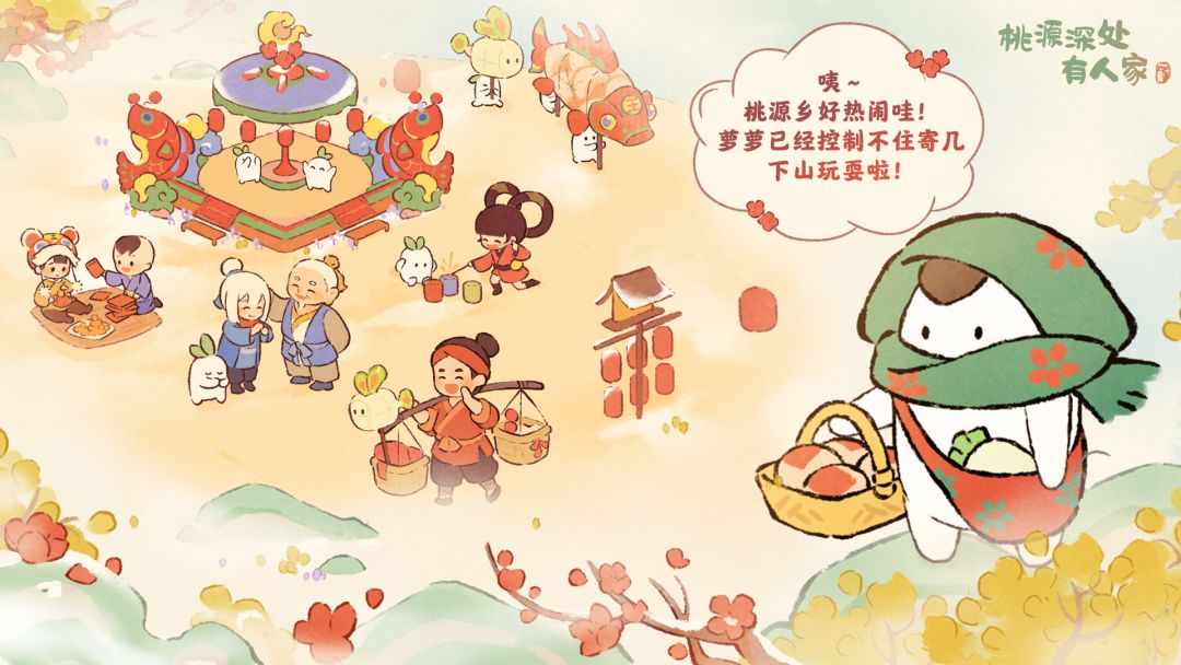 哇哦!桃源乡怎么这么热闹!广场舞台好喜庆啊,鱼灯还冲萝萝眨眼睛,还有很多有趣的东西……萝萝要赶紧回去喊扶光和陶陶一起下山玩耍!