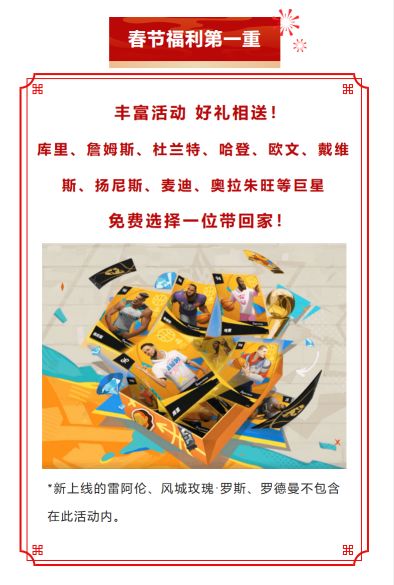从1月29日(大年初一)起,连续6天大家每天上线后前往【街球狂欢季 登录领巨星】活动界面可领取150钻石+1张潮人券,第7天将获赠一份巨星球员自选箱:过往赛季珍贵的现役巨星/传奇巨星,任选其一带回家!