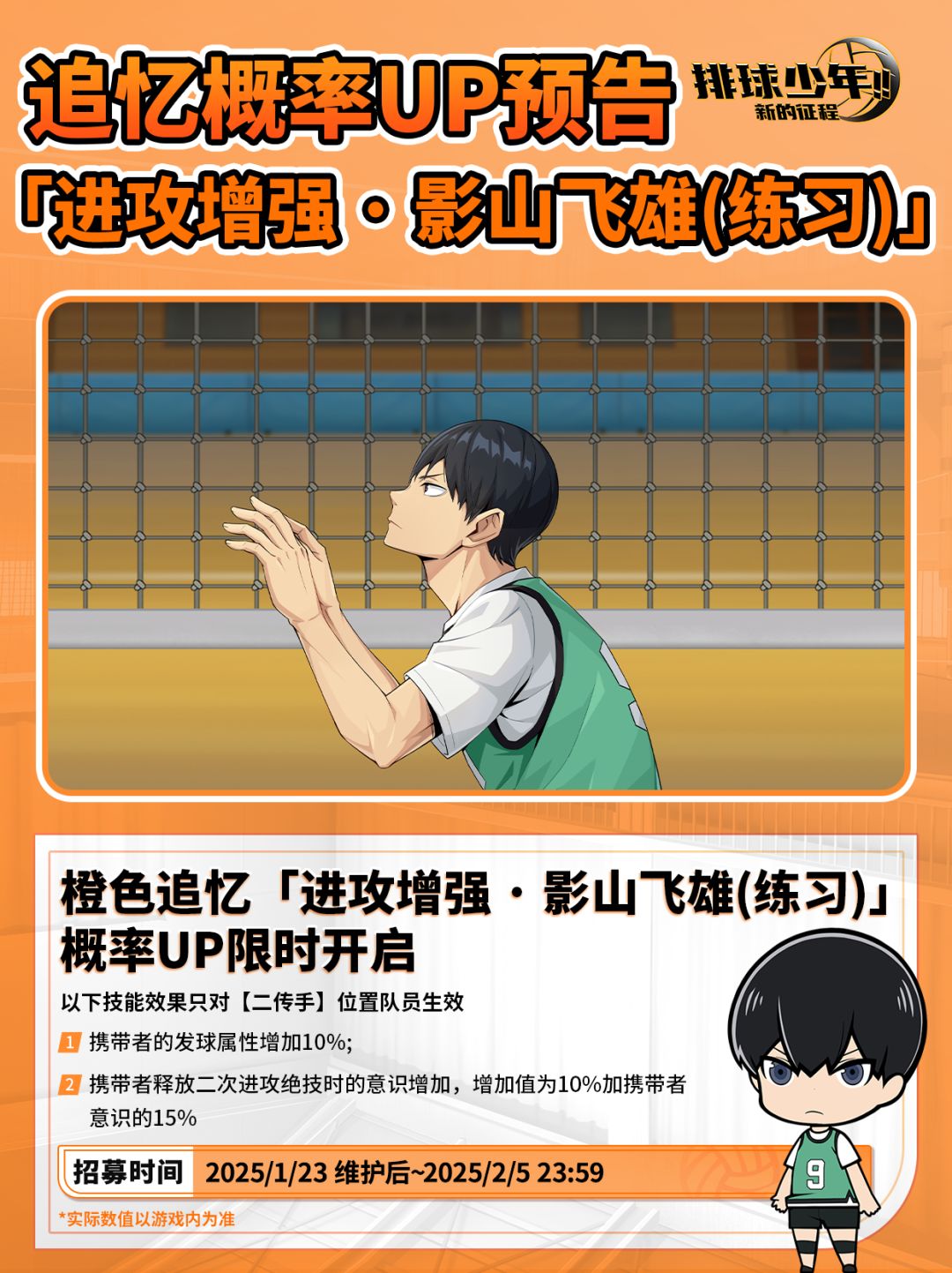 🔸橙色追忆「进攻增强·影山飞雄(练习)」迎来概率UP限时开启!
