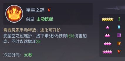 3、主动技能-星空之冠需要玩家手动释放,进化可升阶受星空之冠庇护,接下来5秒内获得24%伤害加成,同时攻击间隔减少30%冷却时间:30秒