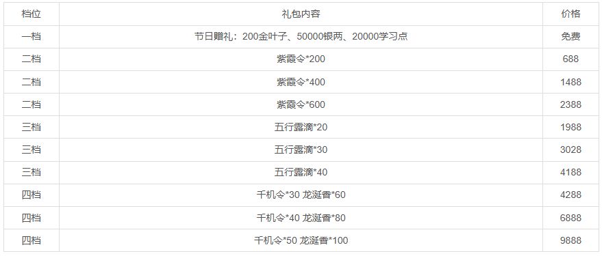 活动一:活动期间将限时上架节日礼包,礼包内容如下: