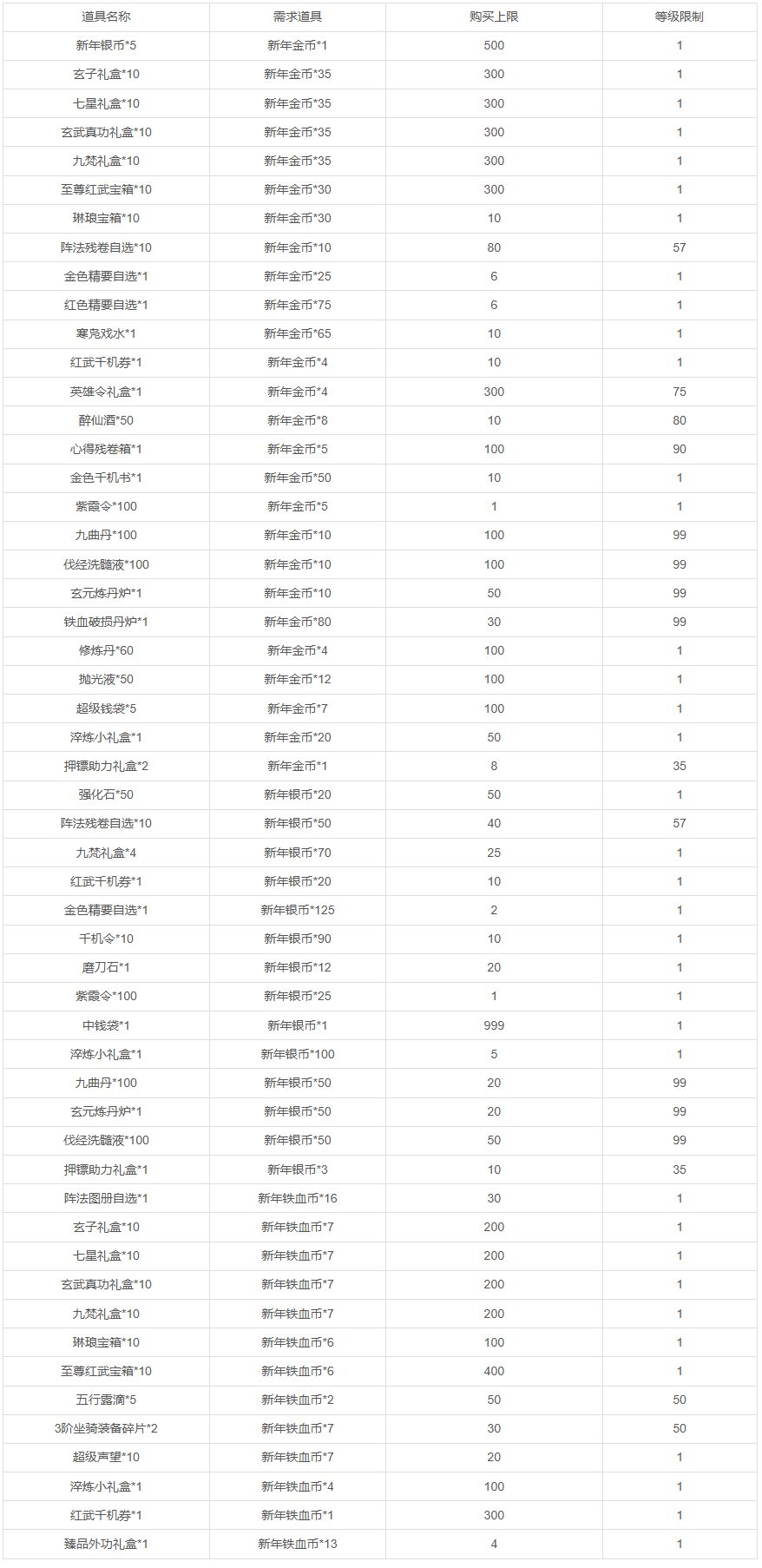 活动期间,通过“江湖磨砺”挂机,在挂机次数内必定掉落“谨”、“贺”、“新”、“春”集字道具中其中1个,集齐四个字可兑换道具“新年银币”,收集“新年银币”可以兑换各式好礼。