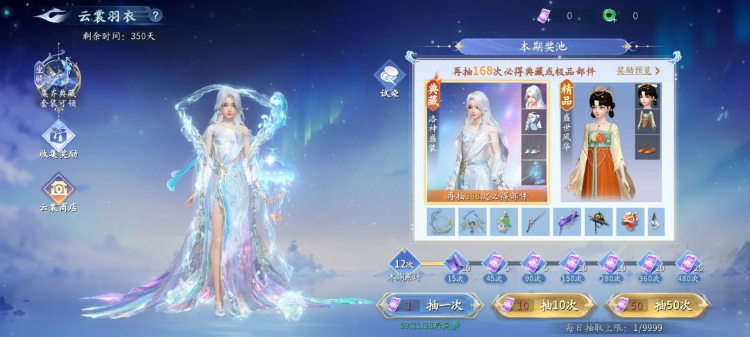 【云裳羽衣】中有典藏、精品时装的时装部件、各种配饰、轻柔染、玉华染、云裳锦、银两等游戏道具和资源,满满当当,步入潮流的第一步就从这里开始。