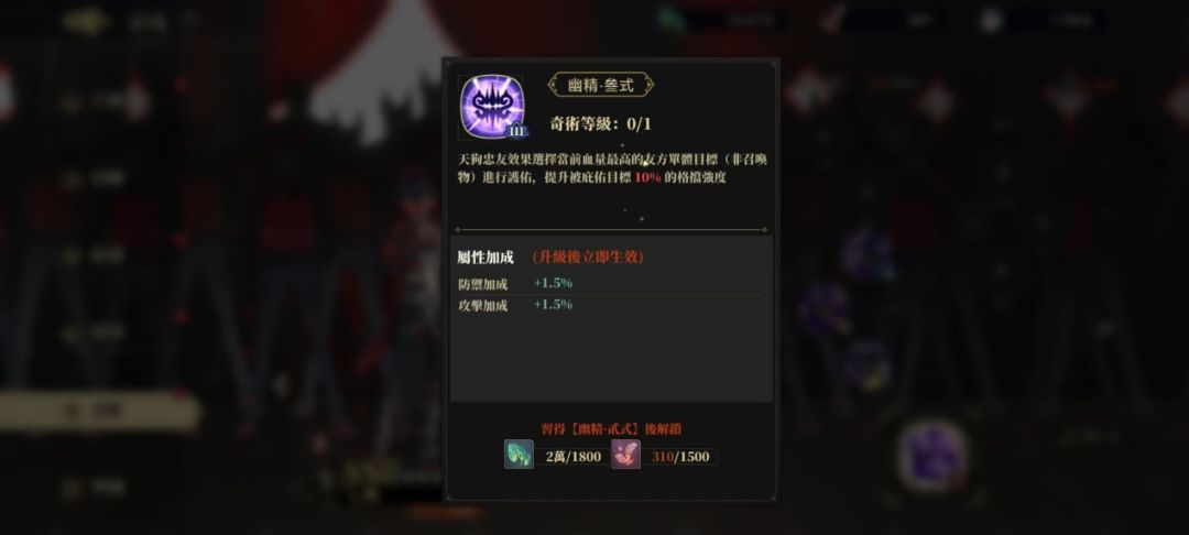 先机:战斗开始时释放1次「忠友」,「忠友」护佑目标所受伤害降低15%,天狗获得免伤效果翻倍「1星激活」