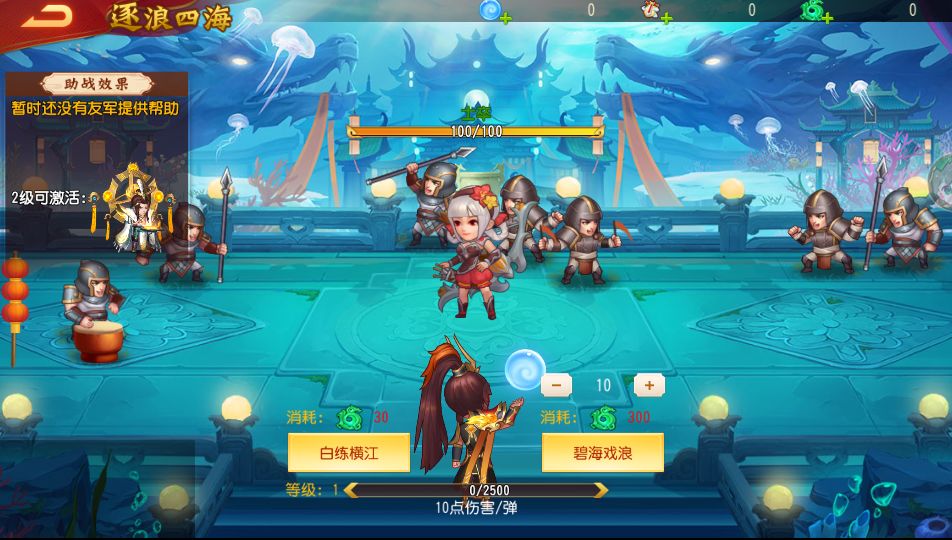 4、主公击败敌军时可获得练兵经验,提升练兵等级可获得更高的投掷水弹伤害并解锁友军助阵;击败神·甘宁不会获得练兵经验。