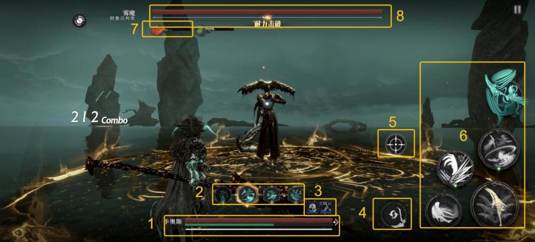 6. 操作区域:普攻、技能、奥义、躲避、破招的按键区域。