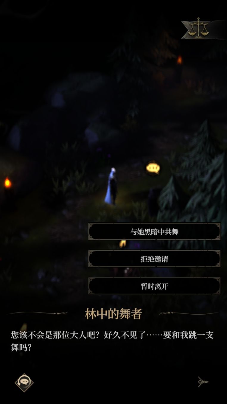 如果在深夜的墓地遇到一位神秘舞者,你会作何反应?共有9269(93%)位堡主选择与她黑暗中共舞,人性值「混沌」+1。