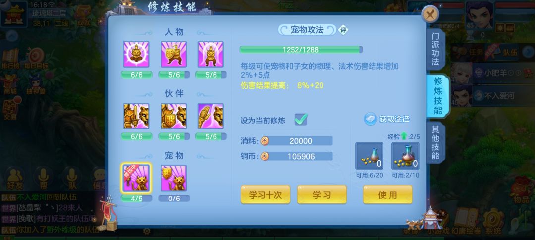 书接上文,进了甲级帮每天抢满15个红包,250万铜币,然后抢世界祝福,还有每天可以捉野生宠物卖铜币,苍蝇腿也是肉,各种活动给的金香果什么的都可以换铜币,记住竞技积分不要换铜币,浪费啊。帮派商店刷新,用帮贡买二级药,每周可以买200个二级药,就是240万铜币,然后多余的帮贡买修炼丹,每天前五个修炼丹有额外修炼经验加成,这些铜币拿到手先别笑,首先给伙伴上满段,然后人物攻修伙伴攻修宝宝攻修优先点满,然后再点伙伴防御法抗修炼,然后人物的防御法抗修炼最后宝宝的物抗法抗修炼。直接用铜币点修炼,如果你想在竞技榜有一席之地的话,如果偏向日常,金香果也不用卖了,毕竟前期只值25万铜币,等服务器等级开高了,可以换50万铜币。