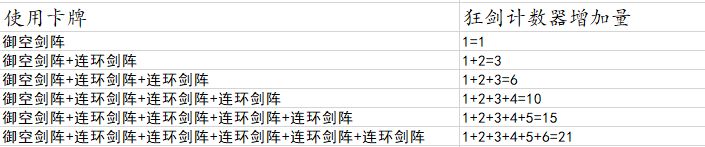 连环剑阵也是狂剑,使用第2张连环剑阵时,依次使用了第1张连环剑阵的效果、御空剑阵的效果、自身,合计3张狂剑。