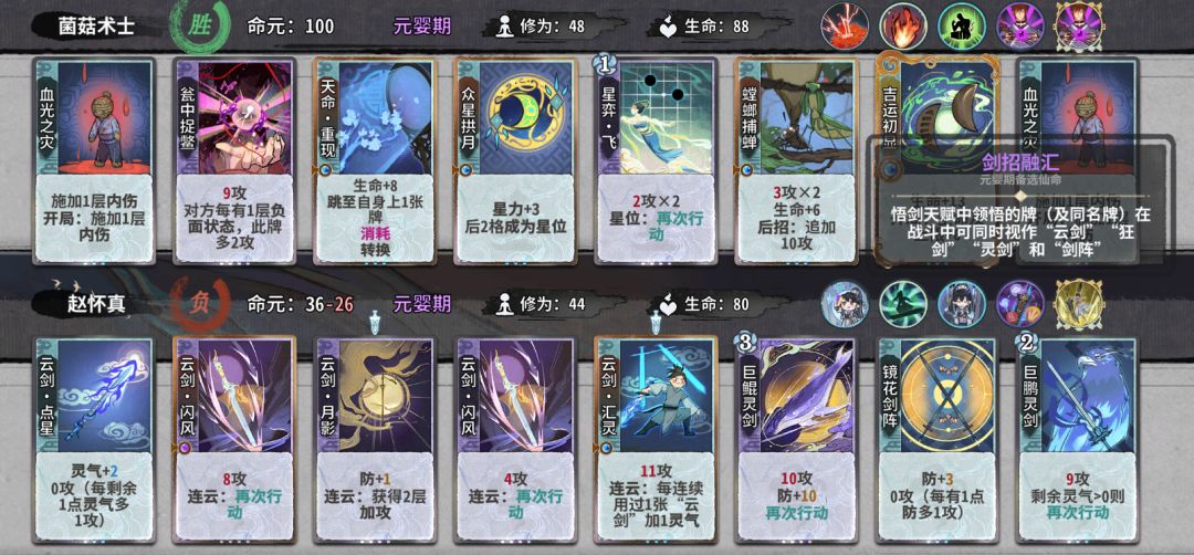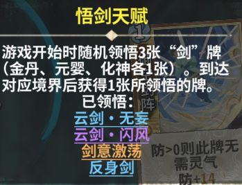 图中云剑月影和云剑汇灵是悟剑天赋所悟卡牌,卡图正上方有标记
